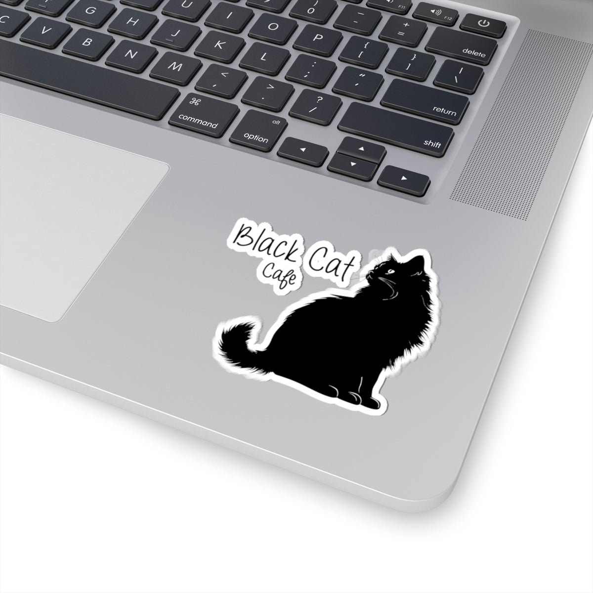 Black Cat Cafe Kiss-Cut Sticker — Cute Silhouette Cat Decal for Laptops & Notebooks