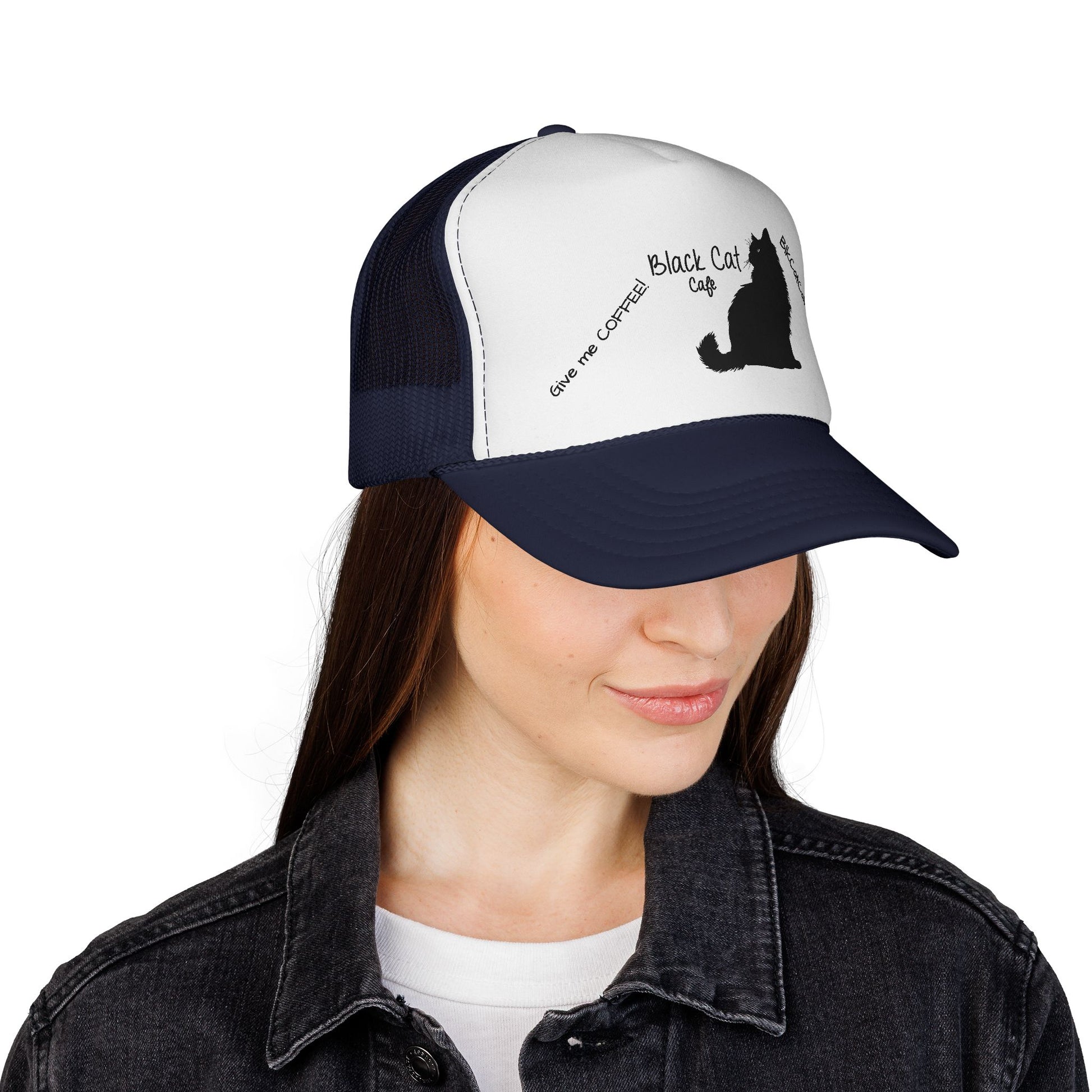 Black Cat Cafe Trucker Hat — 'Give Me Coffee!!!' Silhouette Cap for Cat Lovers